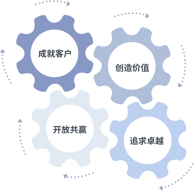 成就客户是一切决策的出发点,,,,创造价值是衡量所有工作的标准,,,追求卓越是我们做事做人的态度,,,开放共赢是我们的格局也是最终的结果。。价值观的齿轮环环相扣,,,推动着组织里的每个人不断向前。。